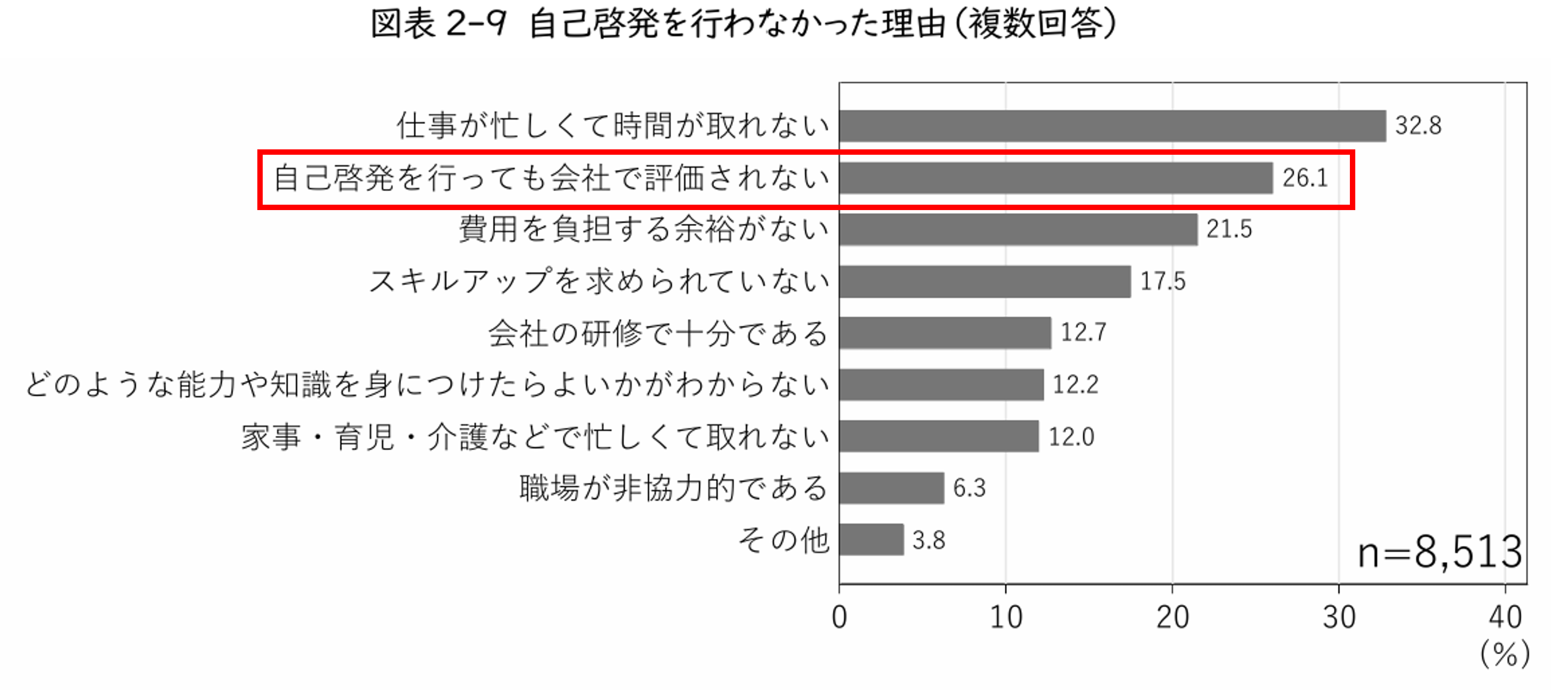 また、従業員側の意識を見ると、自己啓発を行わない理由として「行っても会社で評価されない」と回答した人が26.1%という結果になっています。これは自己啓発に限らず人材育成全般にもつながることですが、育成の機会そのもの、というよりも「育成した結果がどのように仕事や評価につながるのか」が見えにくいことが、成長意欲を阻害してしまっているのではないでしょうか。とりあえず会社から言われたから研修に行ったり自分でもやってみたが、その後会社からは何もなく業務にも活かせているのか分からない、そのようなことが往々にしてあります。