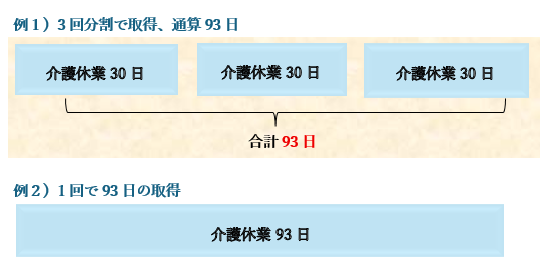 「介護休業制度」とは、労働者が要介護状態(負傷、疾病または身体上もしくは精神上の障害により、2週間以上の期間にわたり常時介護を必要とする状態)にある対象家族を介護するための休業制度です。対象者1人につき3回まで取得可能となり、通算93日まで休業できます。分割での取得も可能です。
