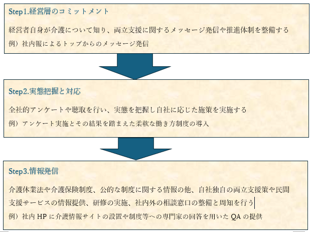 このガイドラインは経営層を対象に仕事と介護の両立支援において企業が取り組むべき事項をステップとして以下の通り具体的に示しています。
