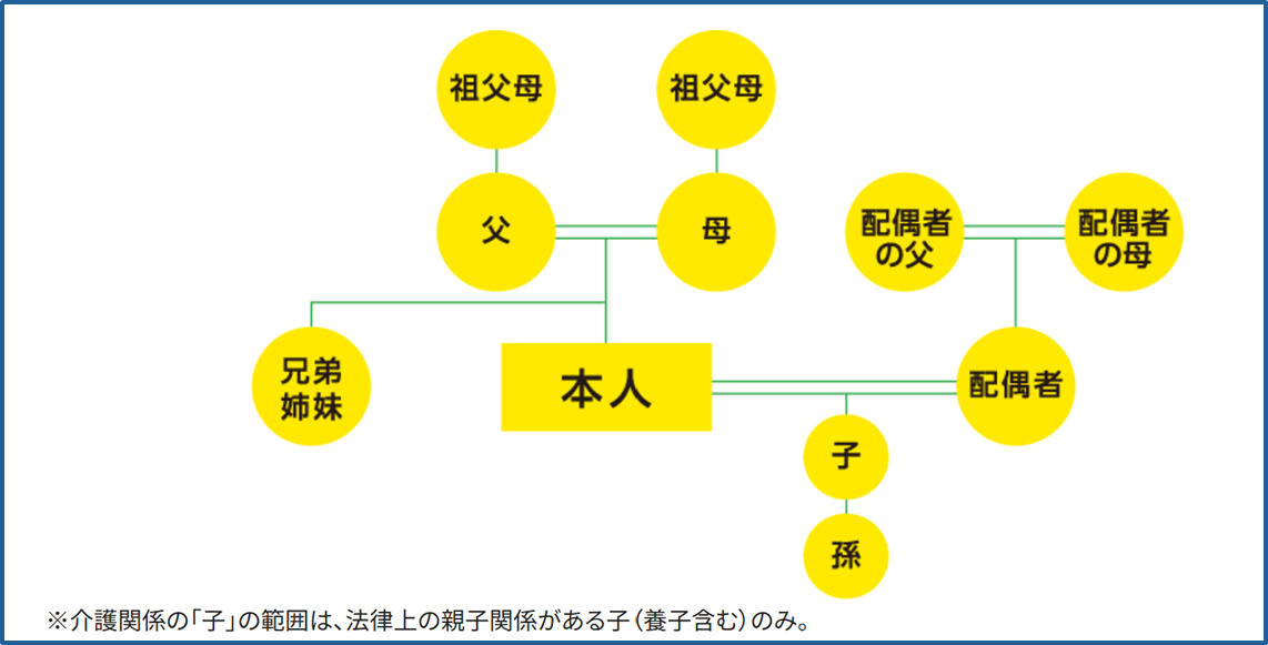 また、対象家族の定義は、配偶者(事実婚含む)、子、父母、孫、祖父母、兄弟姉妹、配偶者の父母となり、対象家族が「要介護状態」の要件(2週間以上にわたり常時介護を必要とする状態)を満たしている必要があります。