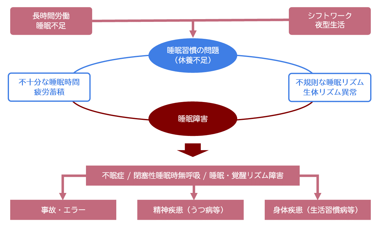 長時間労働や夜型生活による短時間睡眠(睡眠不足)、交替勤務(シフトワーク)による不規則な睡眠リズム、不眠症や閉塞性睡眠時無呼吸などの睡眠障害は生活習慣病の罹患リスクを高め、かつ症状を悪化させると言われています。