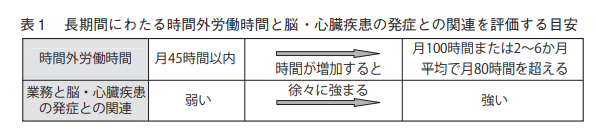 厚生労働省が公表している「脳・心臓疾患の労災認定基準(2001年)」では、業務の過重性を評価 する具体的な負荷要因(労働時間、交代勤務・深夜勤務、精神的緊張を伴う業務など7つの項目)が示され、長期間の過重業務の負荷要因としては労働時間が 最も重要と判断されました。長期間にわたる時間外労働時間注 1 と脳・心臓疾患 の発症との関連を評価する目安が示されています。