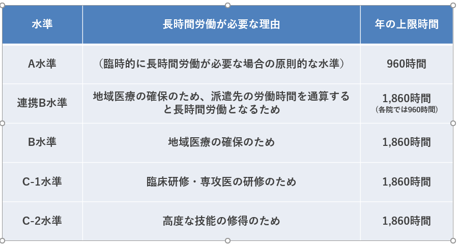 医療機関をA水準・B水準・C水準の3つに分類し、それぞれの水準ごとに医師の労働時間の上限が定められています。